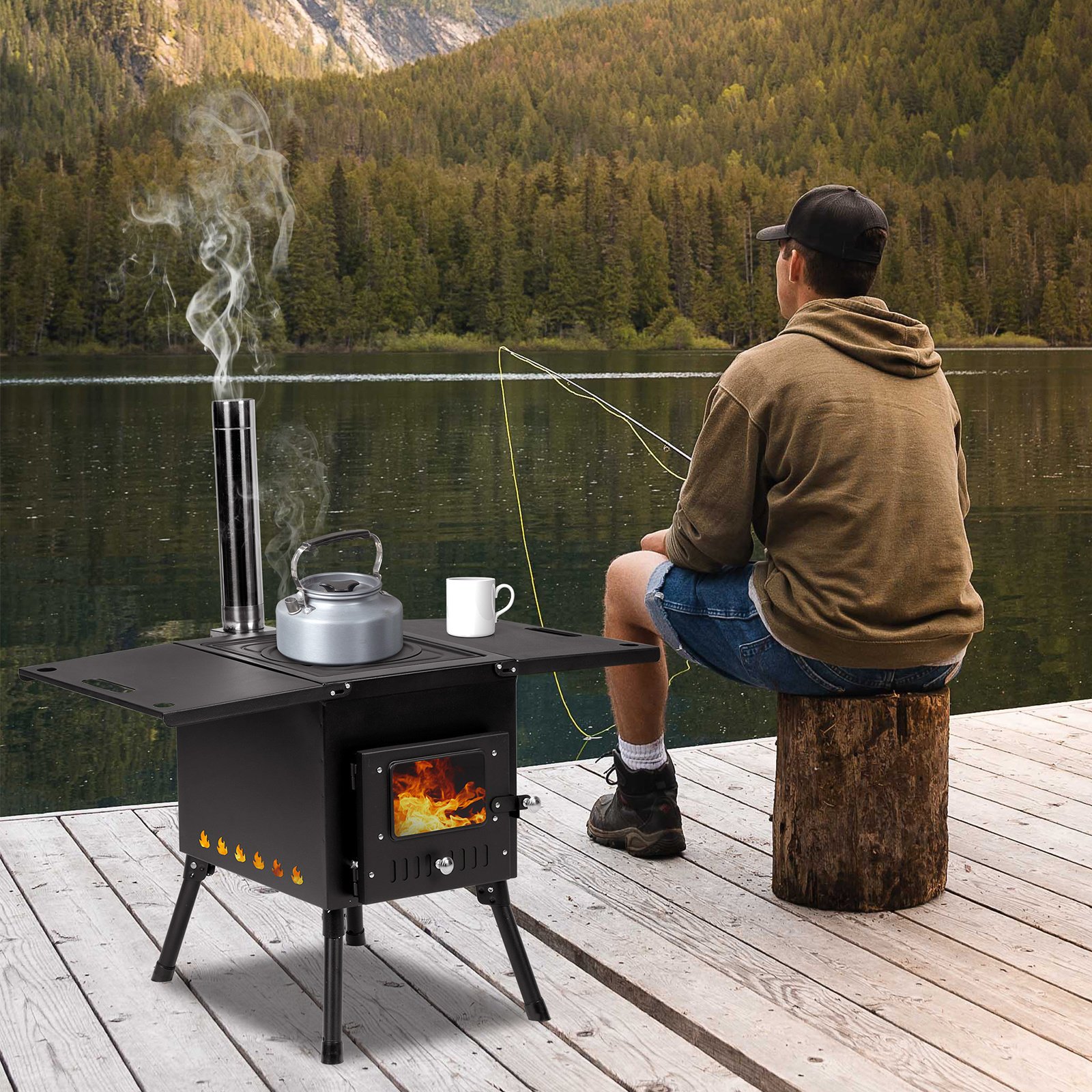 Portable Wood Stove.The folding racks on both sides increase the functionality of easy portability, 32.2lbs. The side frame can be used as a portable. The foldable legs can be folded flat under the stove. The chimney tube can be easily stored in the furnace for easy transportation and storage. The hook that comes with the wood stove makes it easy to clean the ashes at the bottom. Provide more convenience for your camping/hunting trip.