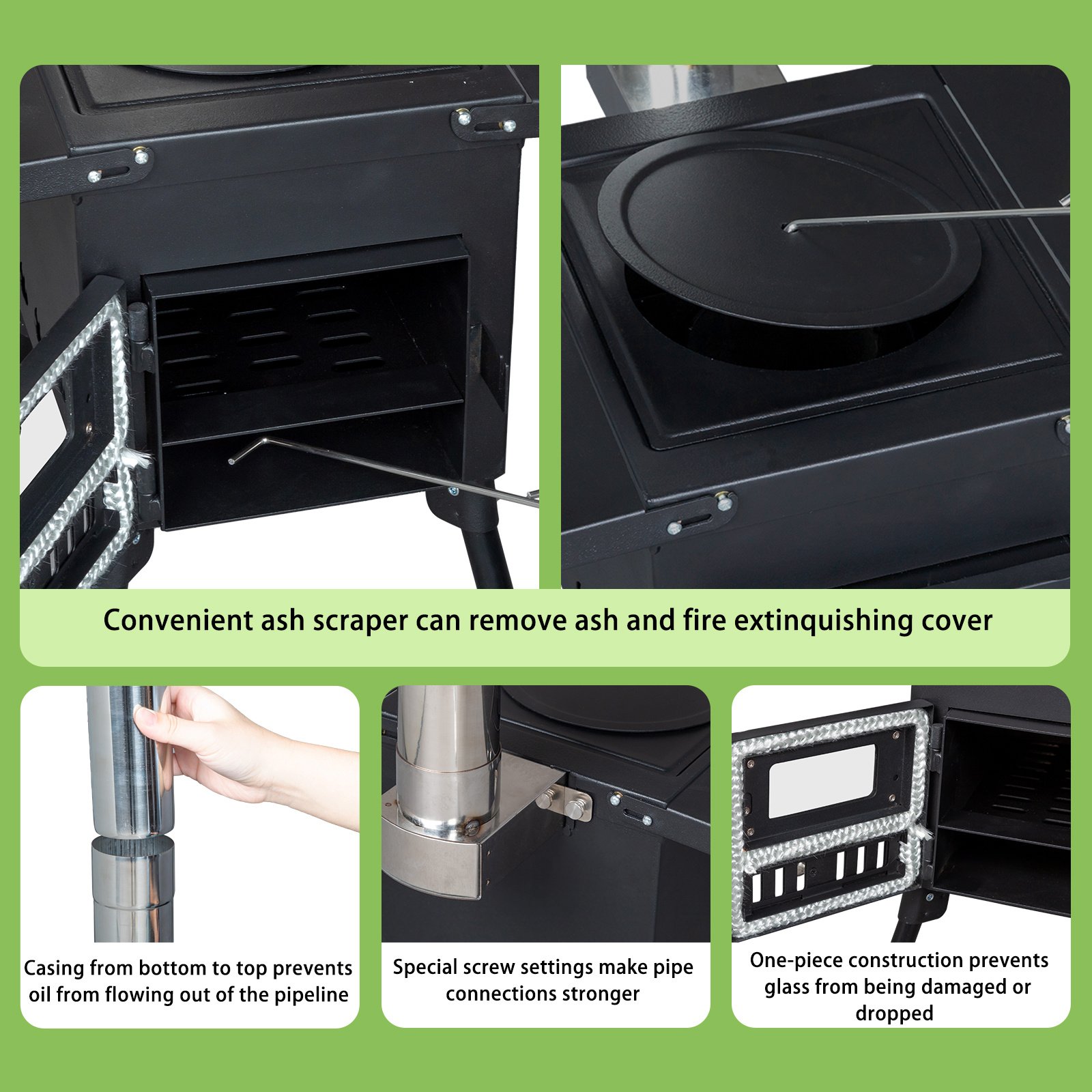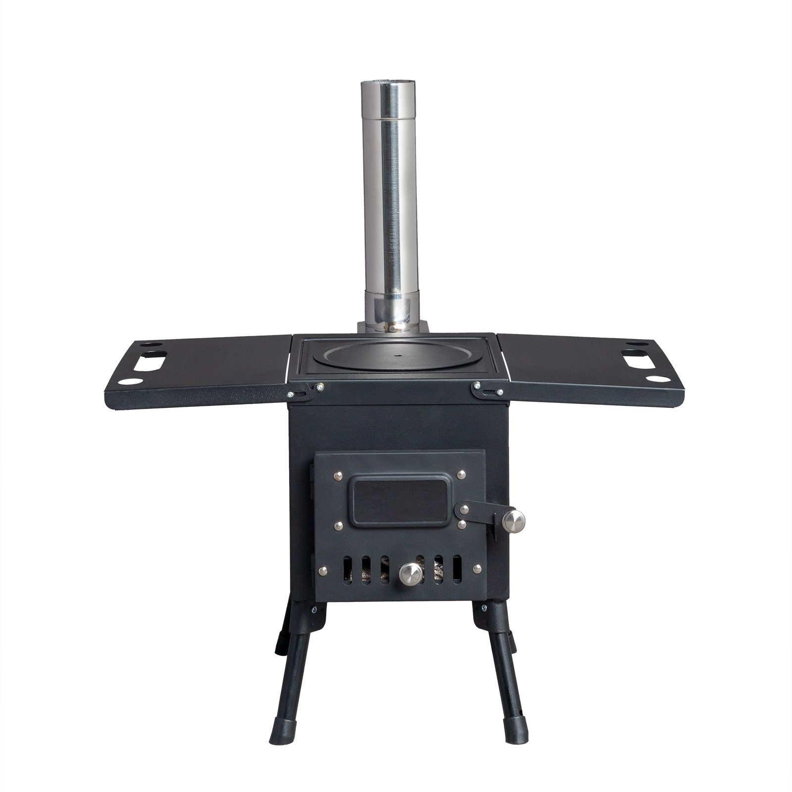 Portable Wood Stove.The folding racks on both sides increase the functionality of easy portability, 17.6lbs. The side frame can be used as a portable. The foldable legs can be folded flat under the stove. The chimney tube can be easily stored in the furnace for easy transportation and storage. The hook that comes with the wood stove makes it easy to clean the ashes at the bottom. Provide more convenience for your camping/hunting trip.